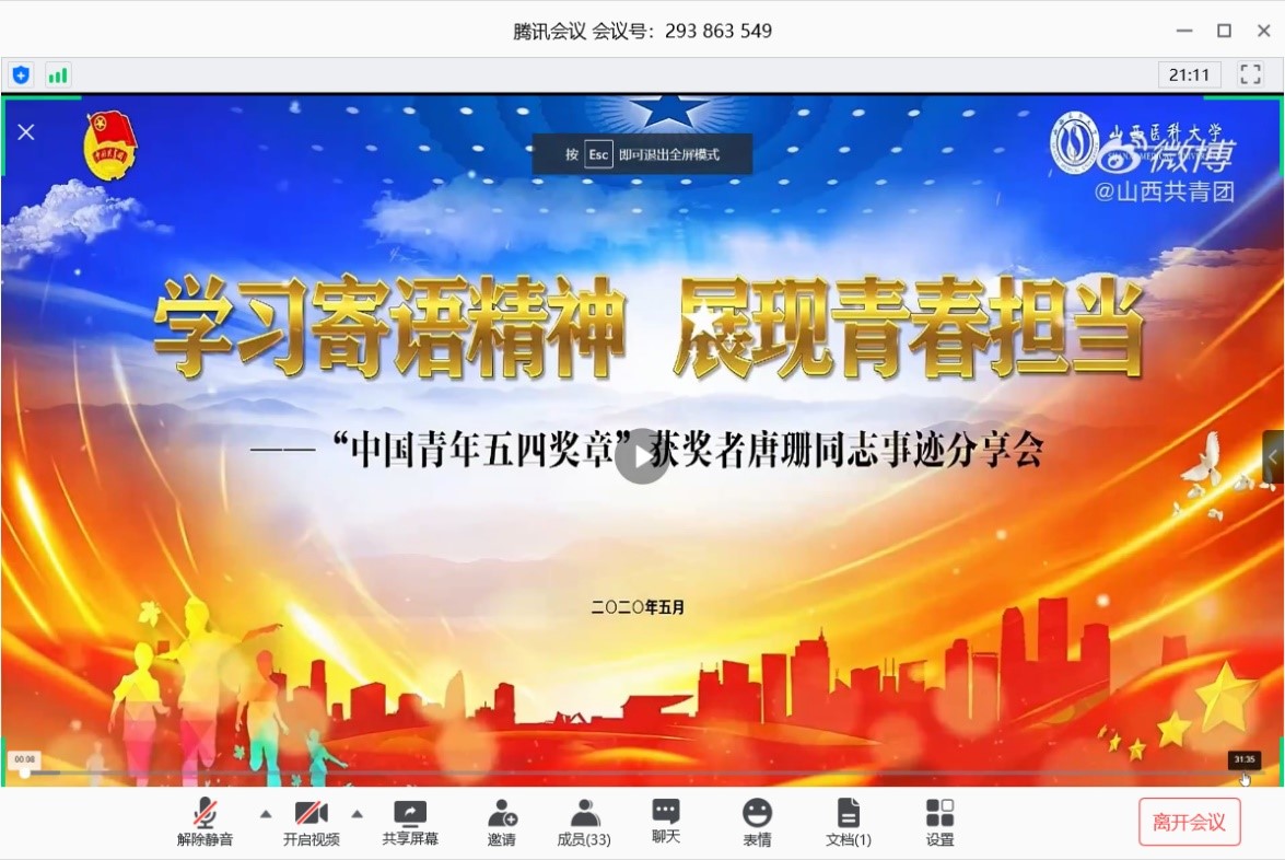 之后,所有参会人员集体学习观看第一场事迹分享会——第24届“中国青年五四奖章”获奖者、山西第二批援鄂医疗队队员、山西医科大学第一医院神经内科护士长、主管护士唐珊以“战役有我,青春无悔”为主题,讲述了她56天援鄂战疫经历。