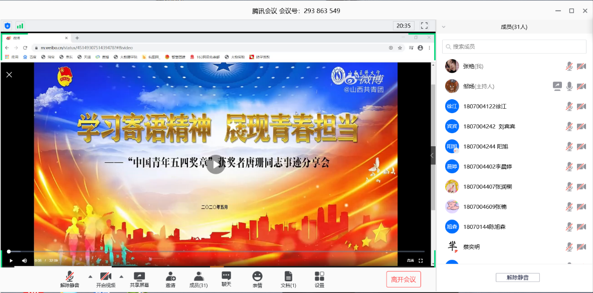 团委于腾讯会议组织学院学生工作骨干共同学习观看由团省委开展的“学习寄语精神,展现青春担当——中国青年五四奖章”获奖者(集体)事迹分享会。