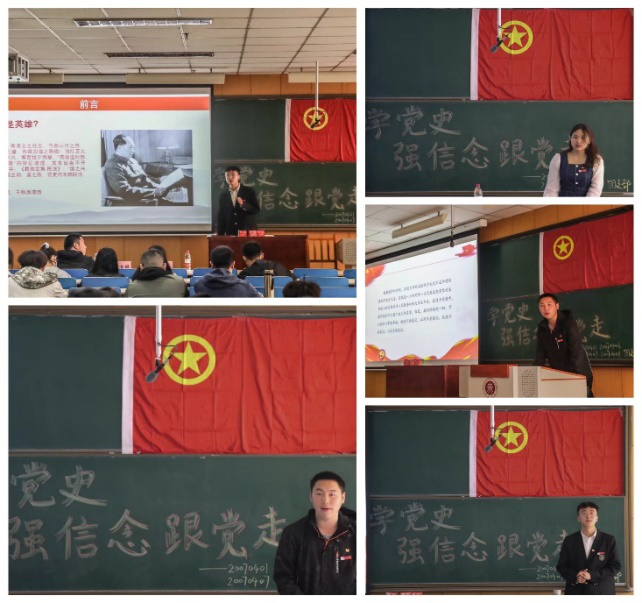 4月12日20070401团支部20070406团支部、20070407团支部20070408团支部在11109联合举办“学党史,强信念,跟党走”主题团日活动。活动邀请了青春宣讲团成员杨宝娜,孙宇飞,汪志阳等同学分别进行“百年风华,清澈的爱,只为祖国”,“回望百年党史,谱写中国经济腾飞”“弘扬红船精神,当代青年的理想与担当”的主题宣讲通过本次宣讲,支部成员们感受到了共产党员们勇担报国于危亡,救民于水火的责任,在一次次血与火的淬炼与砥砺中,中国共产党与中华民族同进步,共成长。