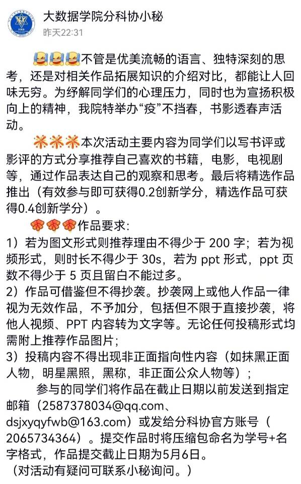 本院学生积极参与投稿,视频、ppt、海报等,更多优秀作品被推荐,如开端,中国医生,云边有个小卖铺,在一起等。活动主旨为丰富同学们的网课生活,向他人推荐一份自己喜欢的,满意的书籍、影视作品。好的书和影视作品比比皆是,能触及本人心灵的却很难得,如果让我们推荐作品,那一定是真正震撼过我们心灵的。