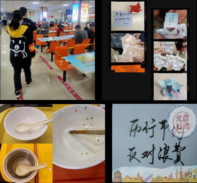 推出“饮水思源,光盘打卡”的活动。20070142团支部与后勤第四食堂合作,协助阿姨打饭,收餐、志愿监督。未返校的同学则晒出自己在家光盘打卡照片,以自己的实际行动传播节约粮食,拒绝“舌尖上的浪费”的正能量。