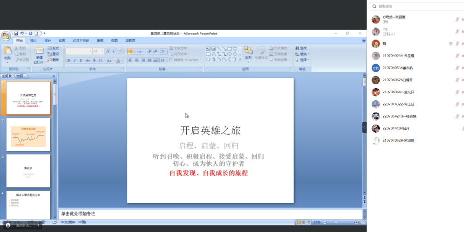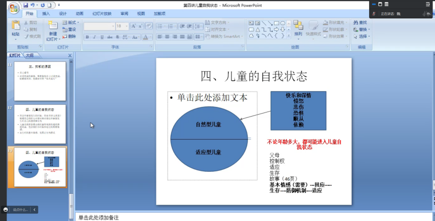 分享过程中,魏老师结合书中内容,引入了冰山理论并向同学们列出了解决心理问题的方式--觉察情绪(一个人的需求是否得到满足后的体验)。并对儿童的自我状态进行了详细的介绍。