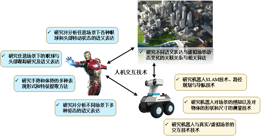 (3)针对传统设备交互范围有限、交互不自然等科学问题,展开智能机器人交互技术,包括手势、体势、眼球和头部的跟踪识别,机器人操控技术方法。